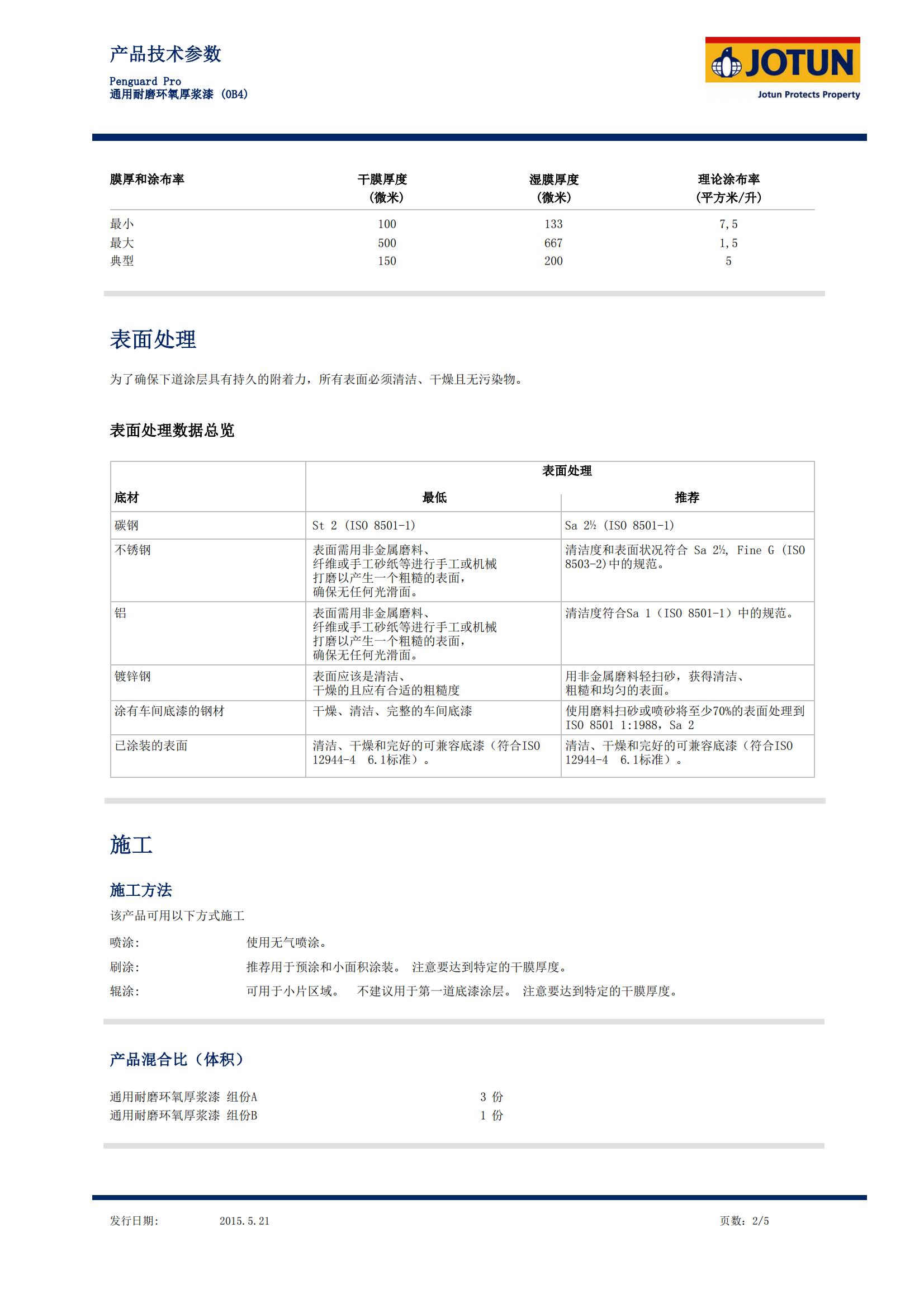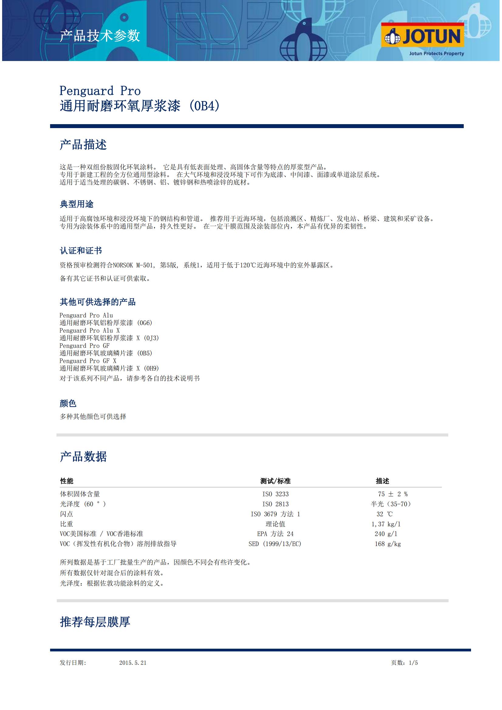 • Penguard Pro 0B4:这是一种双组份胺固化环氧涂料。 它是具有低表面处理、高固体含量等特点的厚浆型产品。专用于新建工程的全方位通用型涂料。 在大气环境和浸没环境下可作为底漆、中间漆、面漆或单道涂层系统。适用于适当处理的碳钢、不锈钢、铝、镀锌钢和热喷涂锌的底材。适用于高腐蚀环境和浸没环境下的钢结构和管道。 推荐用于近海环境,包括浪溅区、精炼厂、发电站、桥梁、建筑和采矿设备。专用为涂装体系中的通用型产品,持久性更好。 在一定干膜范围及涂装部位内,本产品有优异的柔韧性